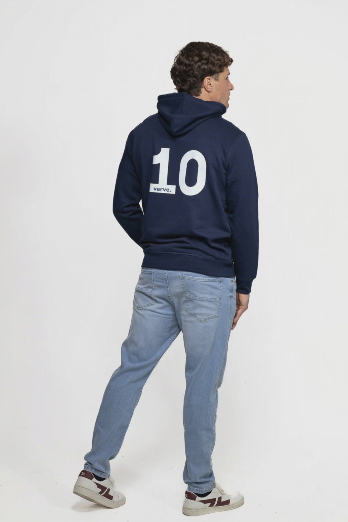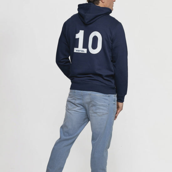 Hoodie de algodón 85 % orgánico con ilustración en la espalda y jugador bordado en el pecho.
