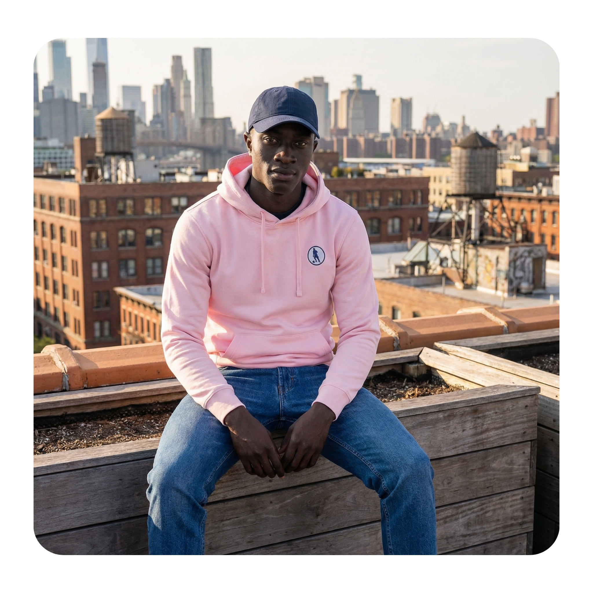 Hoodie de algodón 85 % orgánico con ilustración en la espalda y jugador bordado en el pecho.